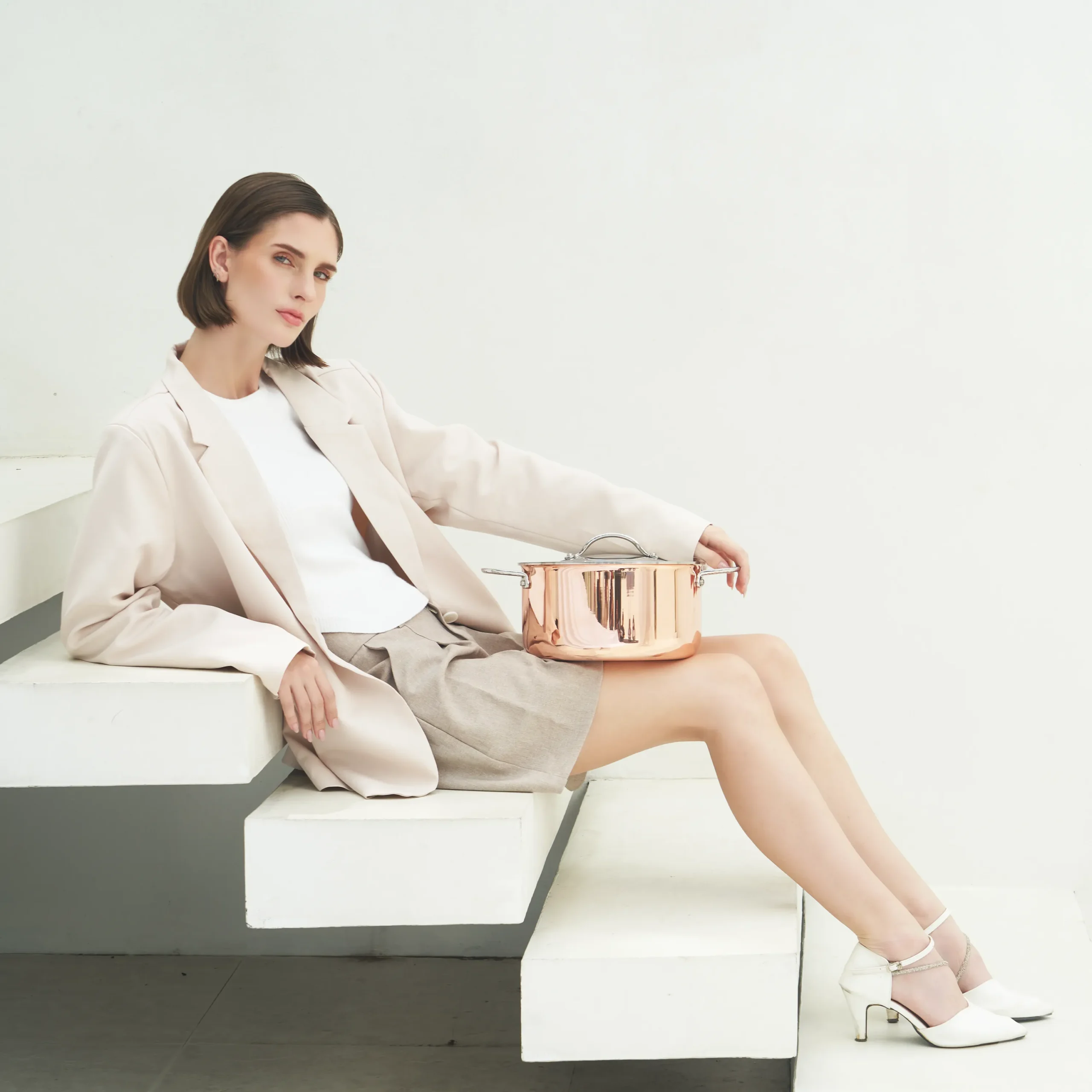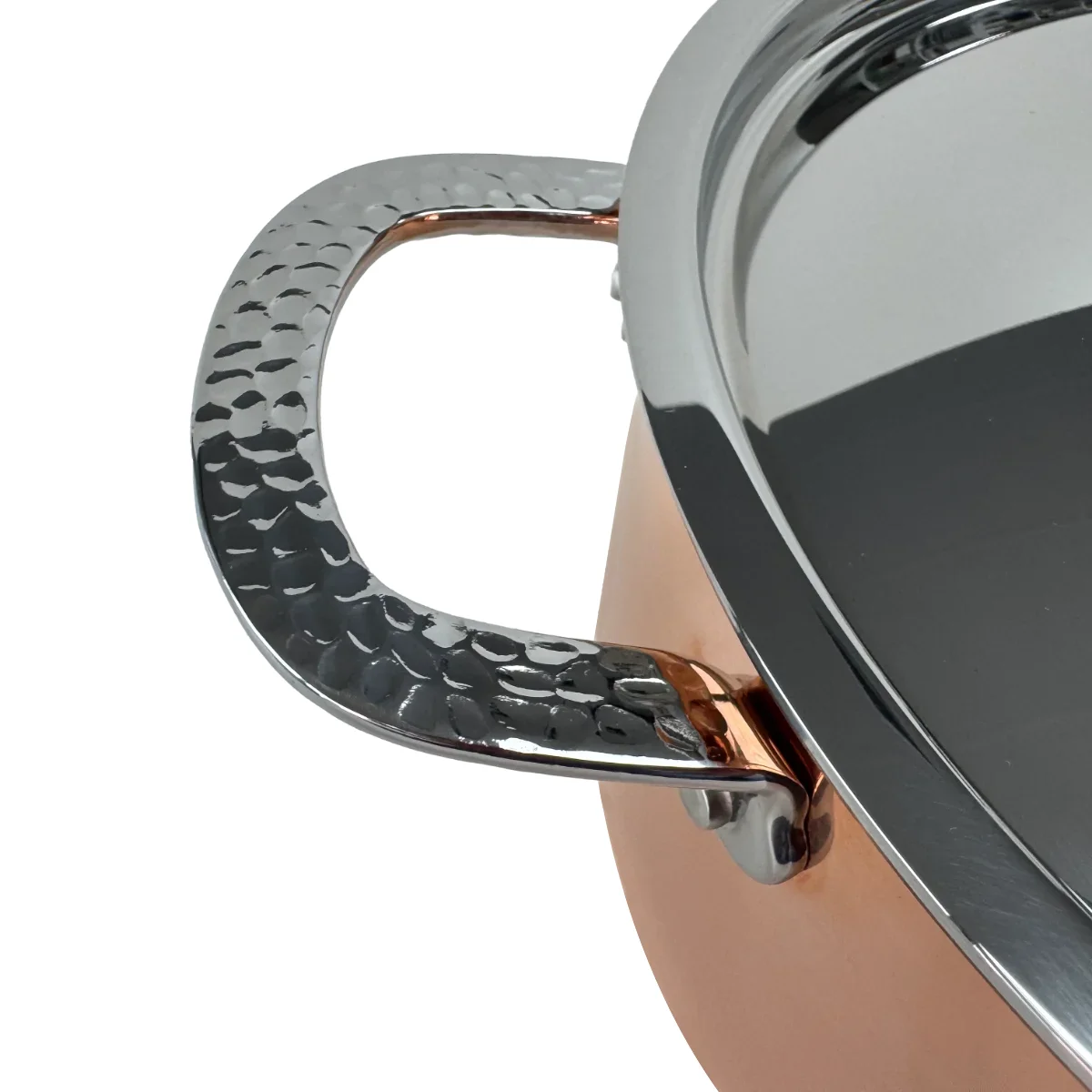 Copper on the outside gives instant, responsive heat and unmistakable warmth at the table. Inside, a stainless-steel cooking surface ensures safe, neutral contact with any ingredient, from tomato sauces and citrus reductions to wine-based stews, without altering flavor or causing discoloration.
